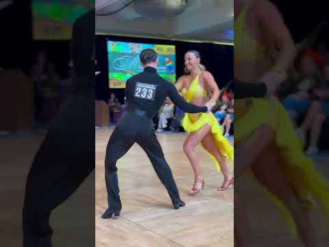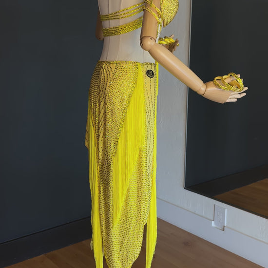 This stunning yellow Latin ballroom dress was worn only once during a professional competition. Made with over 5,000 Swarovski crystals, vibrant fringe, and a secure halter-top bodice, it sparkles beautifully under stage lighting.